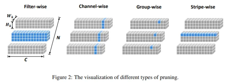 和其他滤波器剪枝方法的比较,如图一所示。Filter-Wise 和 Channel-Wise 方式剪枝的层面太大,可能会损失一些内容,而且无法进行更细的剪枝。而 Group-Wise 方法虽然也有更好的细粒度,但是它忽略了滤波器之间的独立性,即不同滤波器中的无效值的位置可能是不同的,通过 Group-Wise 方法剪枝,可能会剪去一部分有效值。