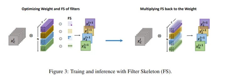 (2) 式即带 FS 的卷积操作,在(1)式中,滤波器权重和 FS 一起进行优化,并且在训练之后,将 $I$ 合并到了权重之中,( $W\odot I \to W$ )在接下来的评估过程中,只使用权重,借此,没有为网络添加额外的运算量。